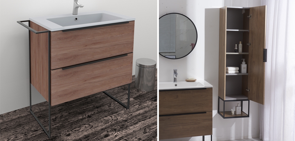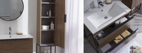A Jersey fürdőszobabútorral pillanatok alatt mediterrán hangulatot teremthet otthonába. A melamin dió felület és a matt fekete lábak és fogantyúk együttesen kellemes látványt biztosítanak, valamint melegséggel töltik meg fürdőszobáját. A soft closing technikának köszönhetően a fiókok csendesen és finoman záródnak, jelentősen növelve a bútor élettartamát.