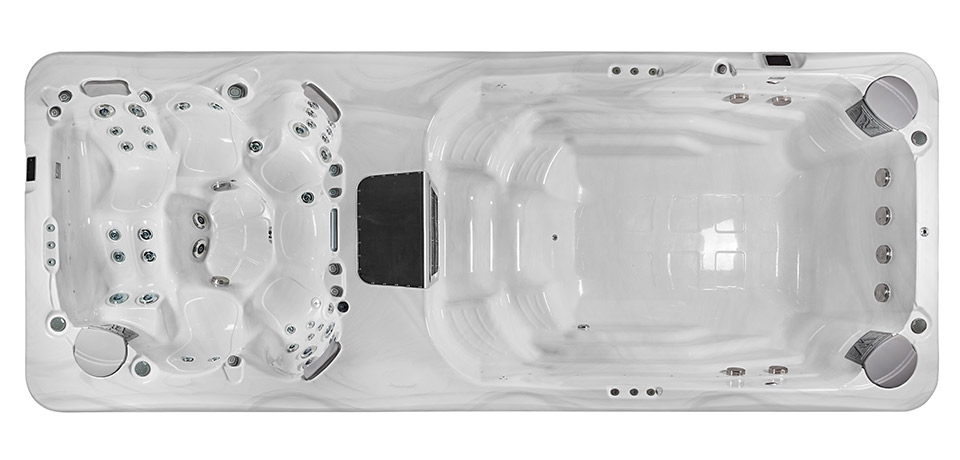A swim spa ellenáramoltató rendszerrel ellátott úszó része teljesen új dizájn szerint lett kialakítva. A medence belső szélessége közel 2 méter, hossza 314 cm, az úszó mélysége körülbelül 120-125 cm. Mérnökeink hosszú időt töltöttek szimulációval, hogy kifejlesszék a medence tökéletes úszótér formáját és megoldást találjanak a leghatékonyabb ellenáramoltató-rendszer megalkotására.